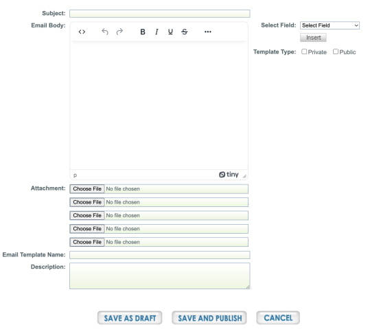 - SAVE AS DRAFT: You can save the email template as a draft but it will not be available as an option to choose until it is published.