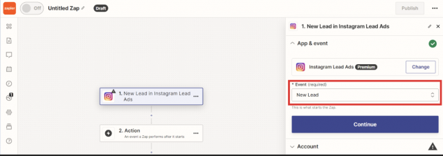 - Select the appropriate Event, such as New Lead, then click Continue.
