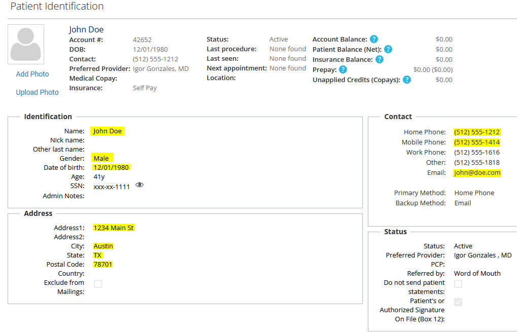 Within your Practice+ account, there are preferences that include Required Fields. Your team will need to manage and ensure that all fields that are required are properly filled out. Below are the defaulted Required Fields within most Practice+ accounts.