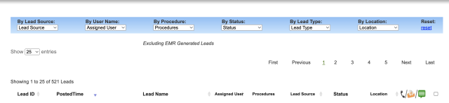 - Lead Type: Use this filter to view EMR-generated leads and sort through any phone calls tracked through MML.